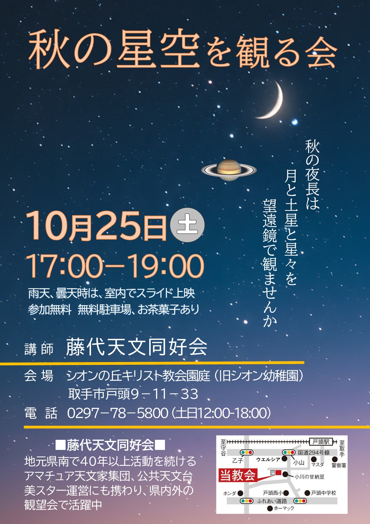 暑い夏が過ぎ星が輝きを増す秋。月と土星、また秋に見える星々をご一緒に見ませんか。どなたでも歓迎致します。当日は涼しくなりますので、上着をご用意の上お越しください。また、曇り、雨天の場合は室内にてスライドの上映や星のお話を致します。お楽しみに。